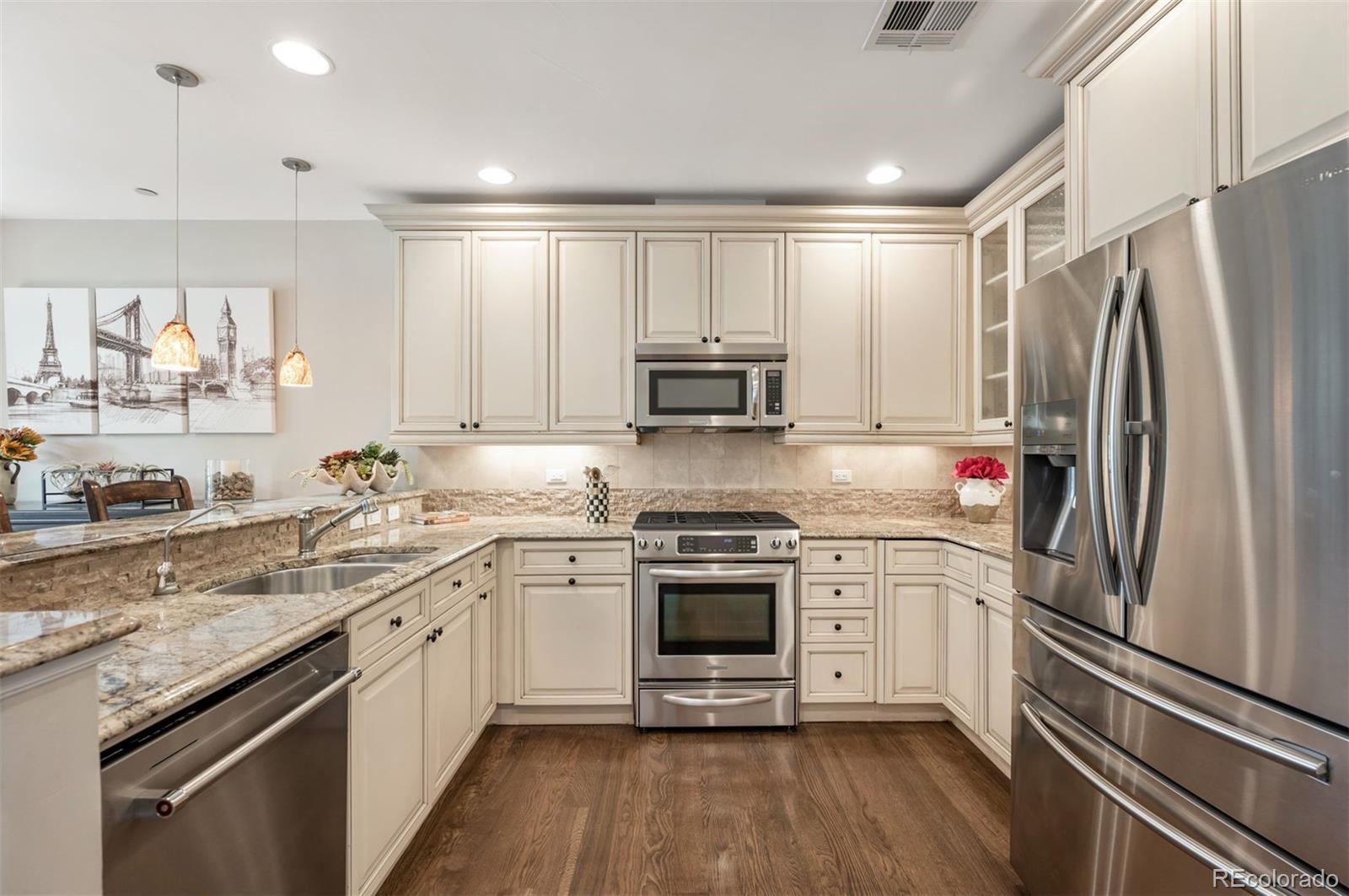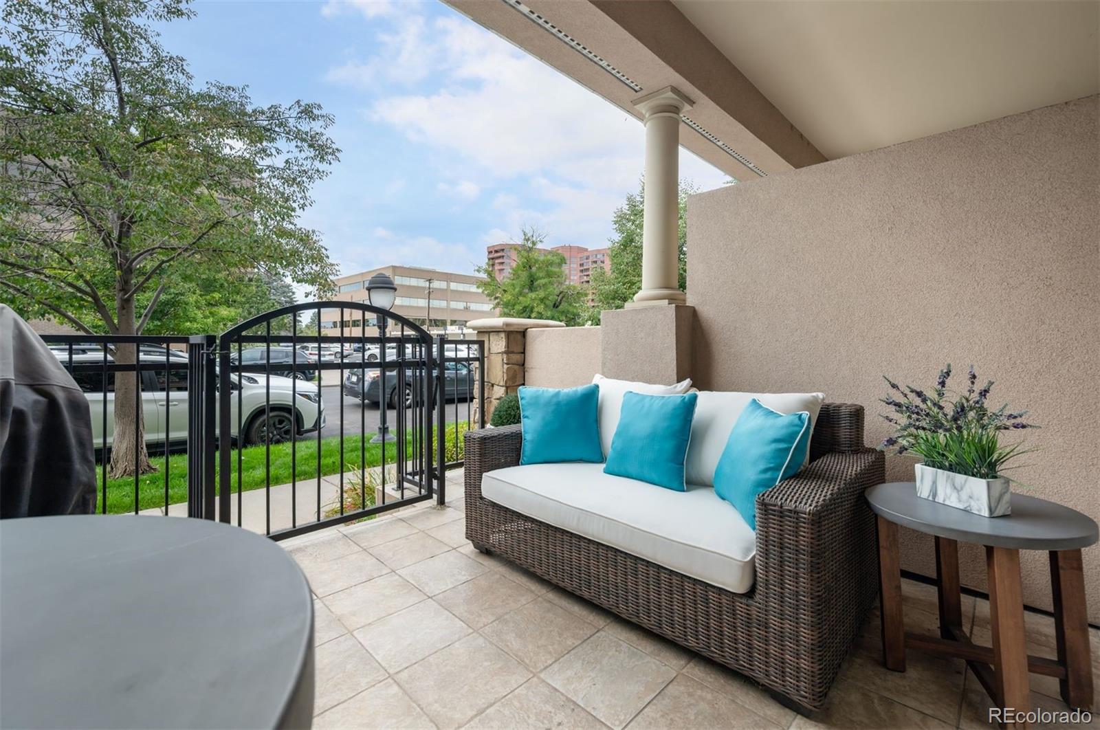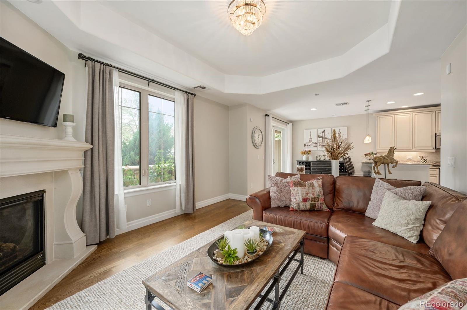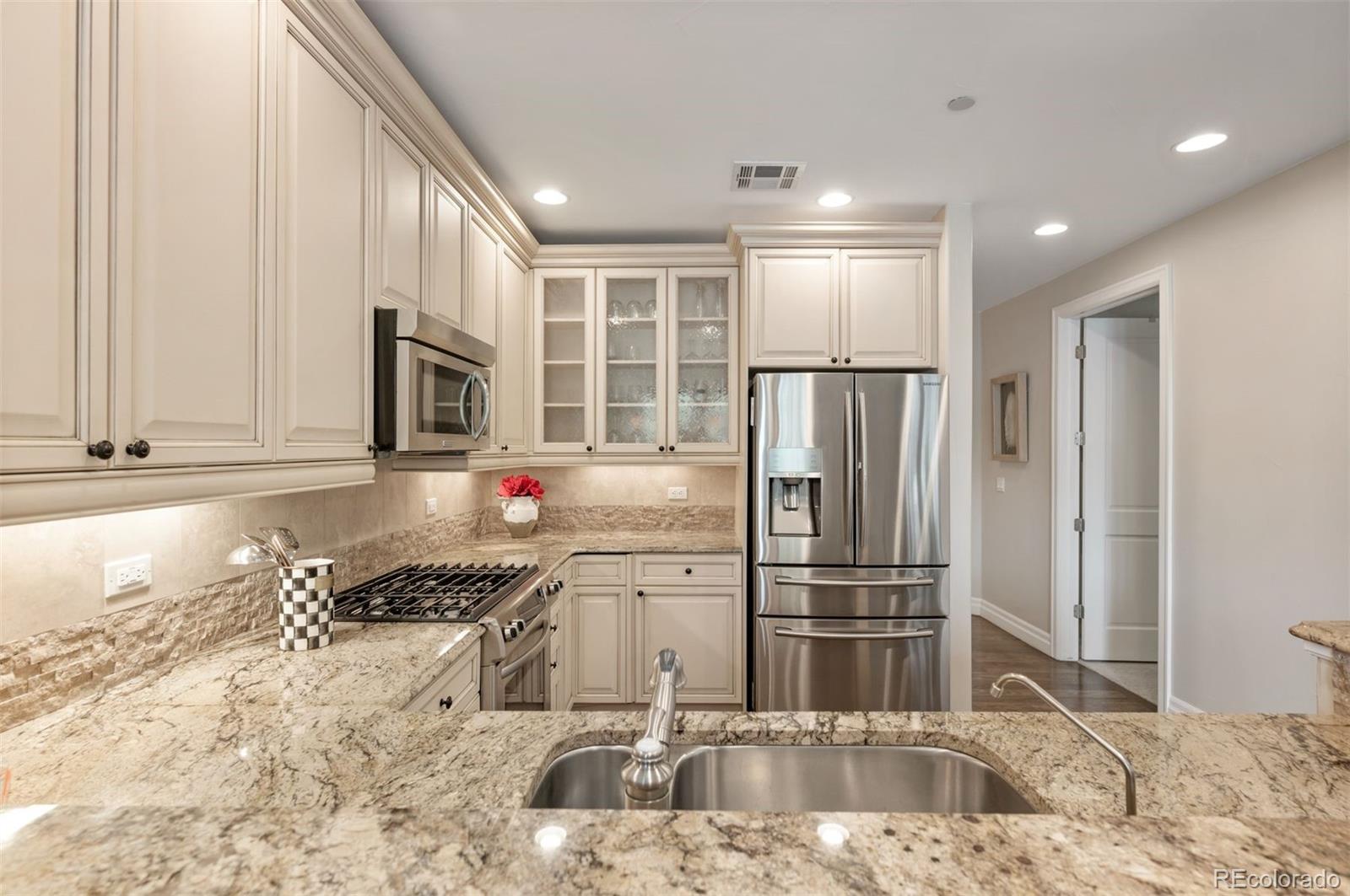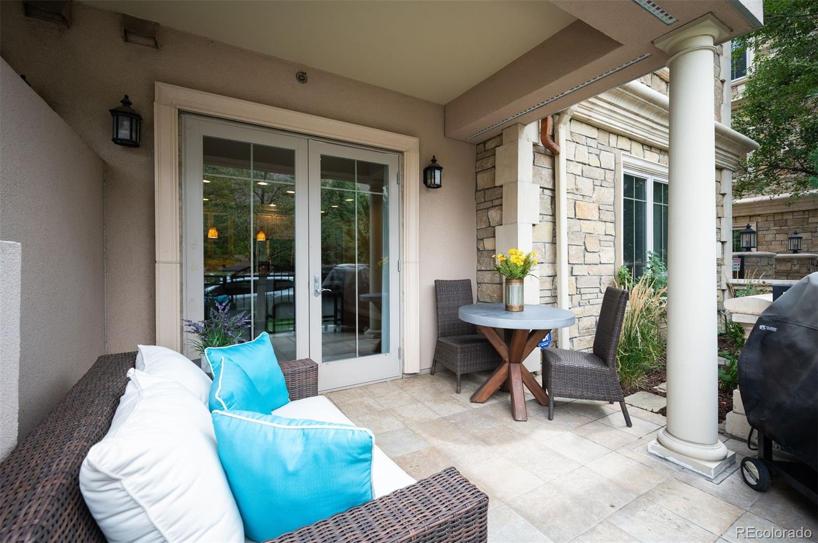Cherry Creek perfection, ideally located close to world-class dining and shopping, plus parks, trails, downtown and more. This elegant condo features an open floorplan with beautiful kitchen showcasing stainless appliances, granite countertops, 42" cabinets, custom tile backsplash and breakfast bar. You'll love the ambiance that the coffered ceiling and cozy gas fireplace creates in the great room. Entertaining is a dream with the French door off the dining area onto your covered patio that creates your own entrance without going through the lobby. The primary suite features a five-piece bath with custom shower and walk-in closet. The second bedroom, hall bath and laundry complete the layout. Two garage parking spaces and a storage closet provide plenty of room for all your gear. This delightful home is move-in ready, all you have to do is unpack and start enjoying that Cherry Creek lifestyle!