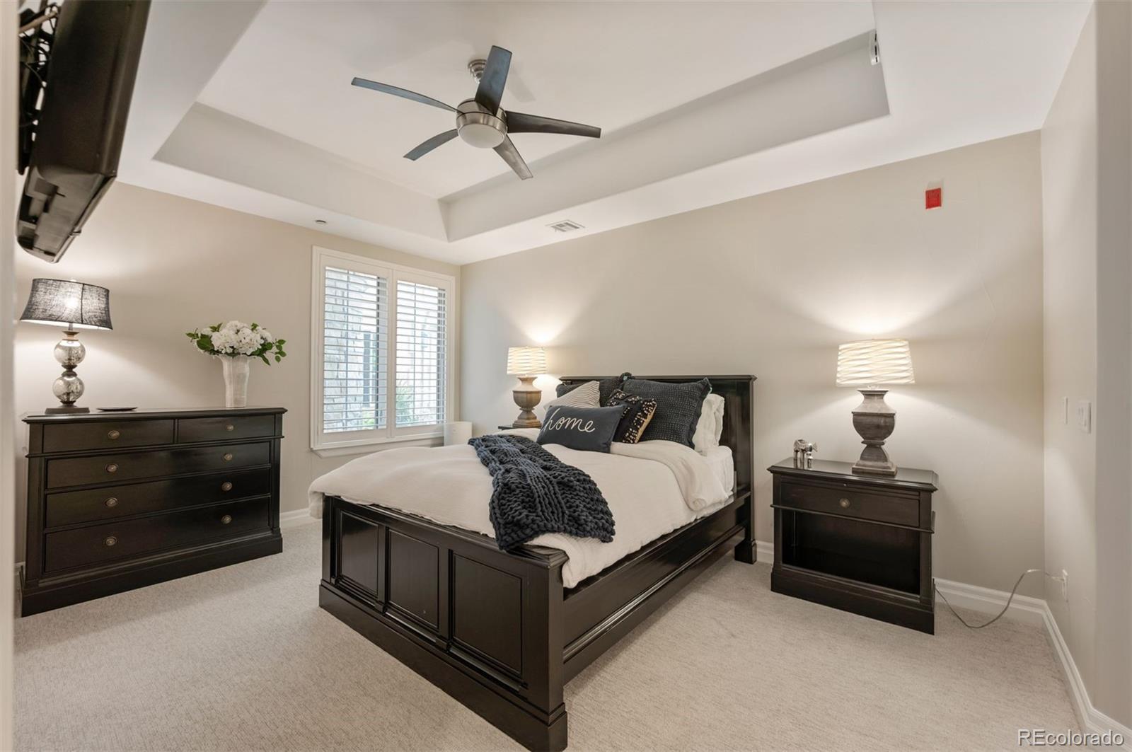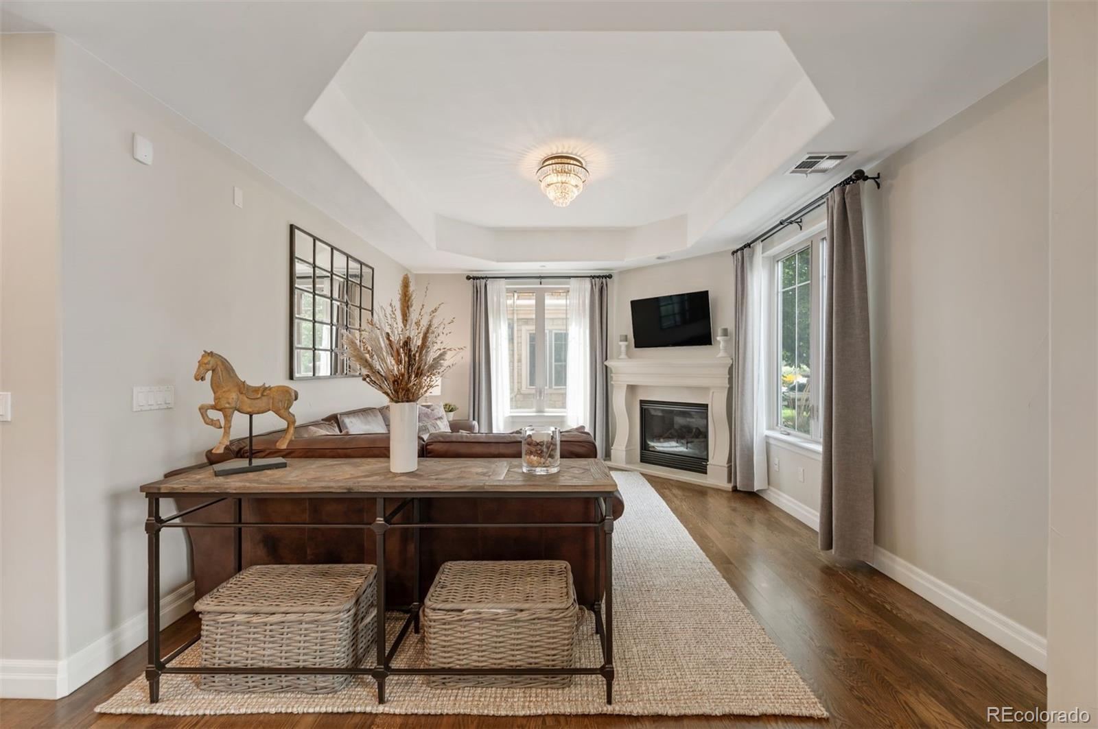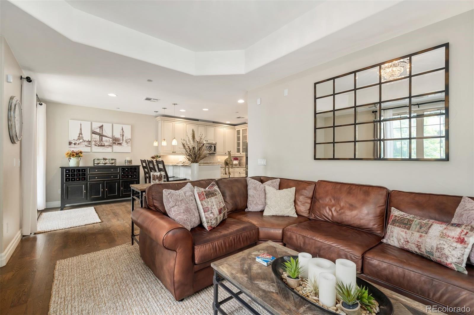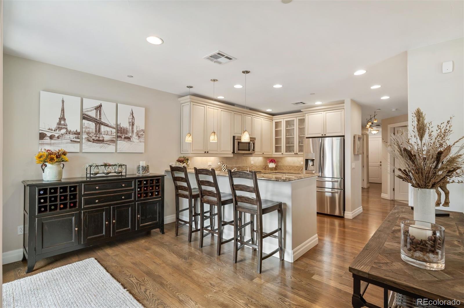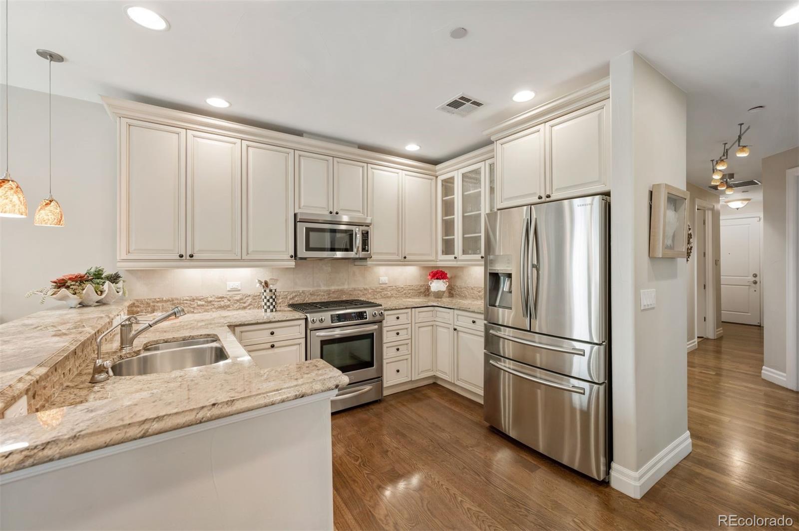 Cherry Creek perfection, ideally located close to world-class dining and shopping, plus parks, trails, downtown and more. This elegant condo features an open floorplan with beautiful kitchen showcasing stainless appliances, granite countertops, 42" cabinets, custom tile backsplash and breakfast bar. You'll love the ambiance that the coffered ceiling and cozy gas fireplace creates in the great room. Entertaining is a dream with the French door off the dining area onto your covered patio that creates your own entrance without going through the lobby. The primary suite features a five-piece bath with custom shower and walk-in closet. The second bedroom, hall bath and laundry complete the layout. Two garage parking spaces and a storage closet provide plenty of room for all your gear. This delightful home is move-in ready, all you have to do is unpack and start enjoying that Cherry Creek lifestyle!