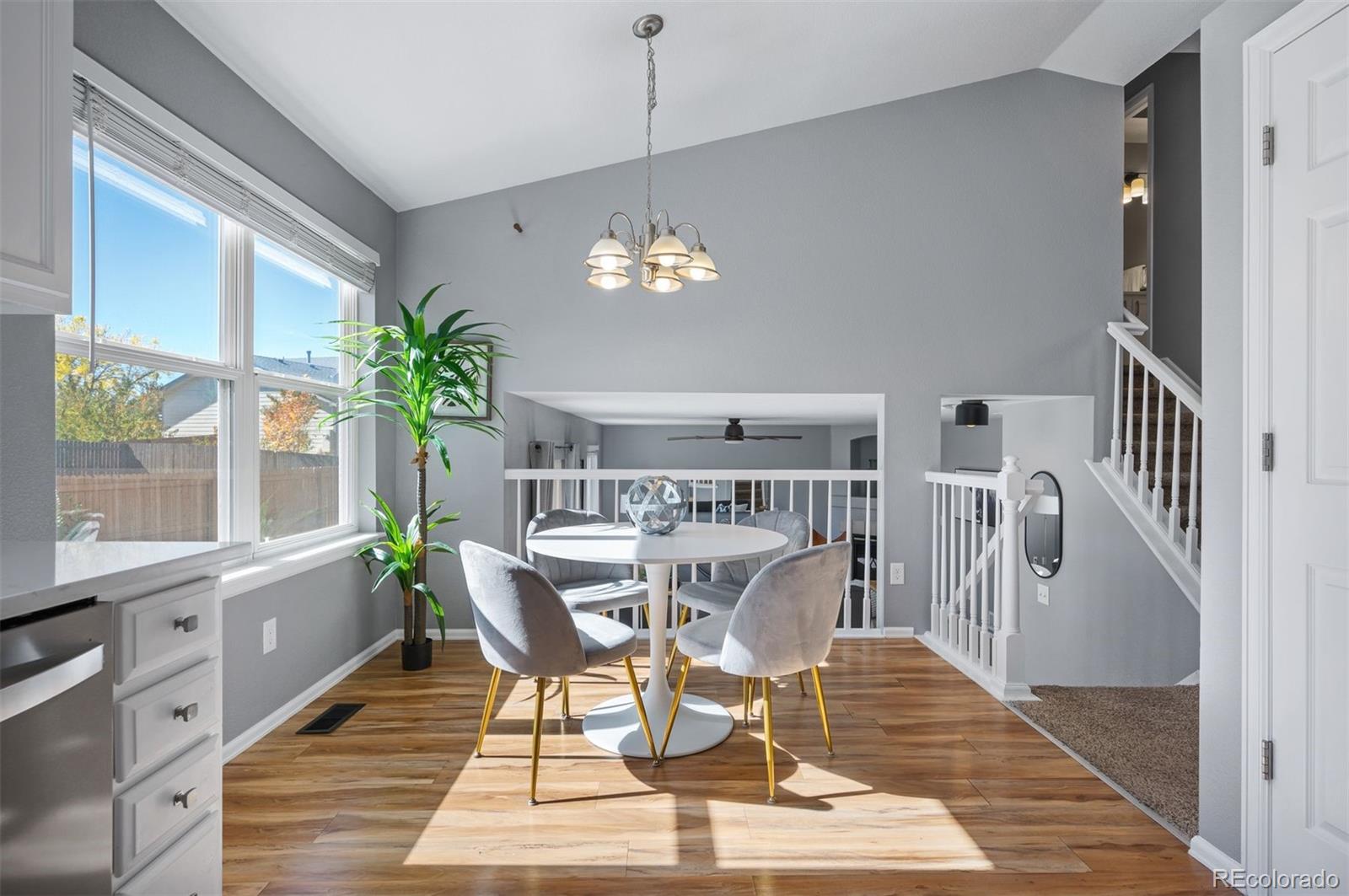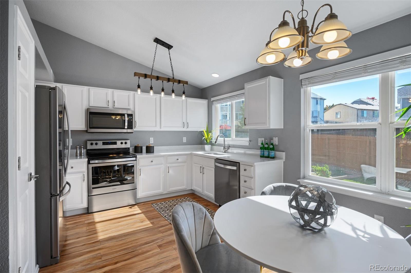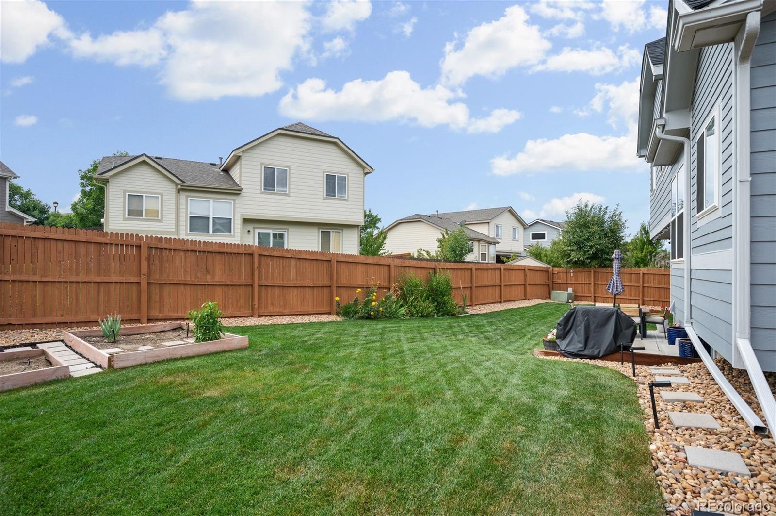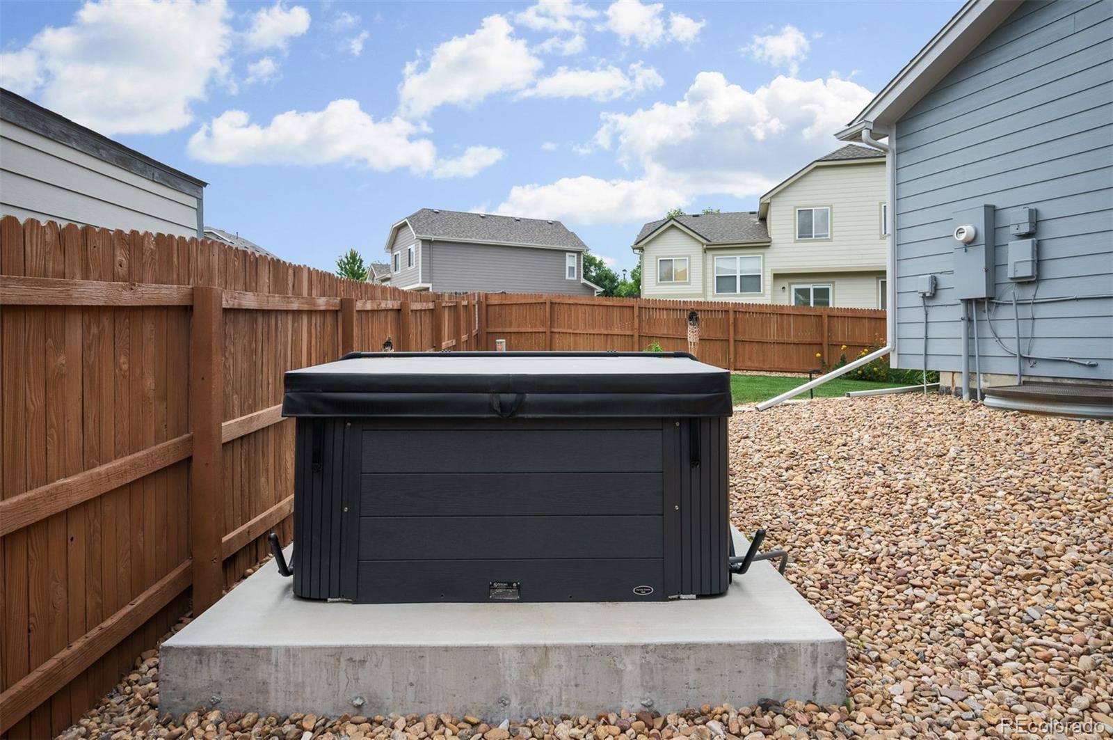 Phenomenal cul de sac location in Cherry Creek School District, close to neighborhood pool, parks, trails, shopping and dining. The minute you walk into the living room you'll notice the abundance of natural light throughout. The kitchen is beautiful with quartz countertops, stainless appliances, pantry and eat-in dining space. Entertaining is a dream with large family room featuring a cozy gas fireplace and sliding glass door. Step into your private backyard oasis with lush green grass, and generous patio, ideal for hosting gatherings and entertaining. Just as you had hoped, there's a hot tub to enjoy those beautiful Colorado nights. Upstairs you'll find three bedrooms. The primary suite has a 3/4 bath with quartz countertops. The full bath in the hall also has quartz countertops. Newer flooring and paint inside and out, means no maintenance for years to come. Totally move-in ready with window coverings, washer and dryer. The basement has a fourth bedroom and half bath, laundry and gear storage. The attached two-car garage completes the package. All you have to do is unpack and start enjoying that Colorado lifestyle.